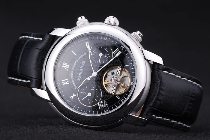 Armband: Schwarz Krokodillederband mit weißen Fadenheftung und Wärme geprägt Audemars Piguet Name und das logo und ein Audemars Piguet beschriftet Edelstahl Flip-über Haken clasp
