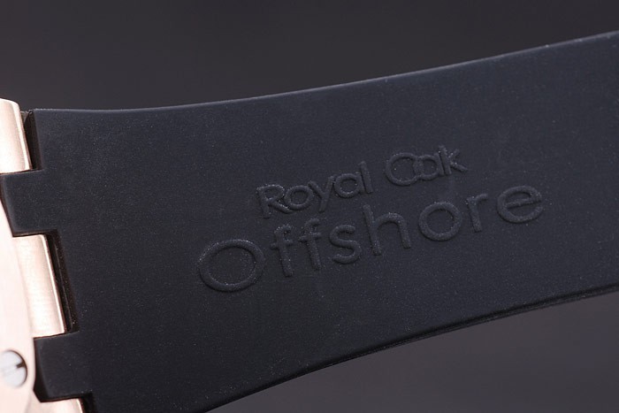 Armband plattiert: Schwarzes Kautschukband mit Hitze geprägt Audemars Piguet Royal Oak Offshore Stempel und ein Audemars Piguet eingeschrieben ionenplattiert Haken-Schnalle clasp