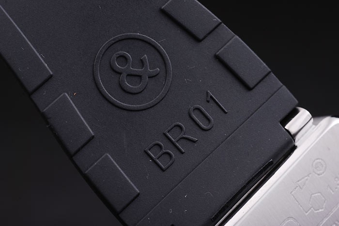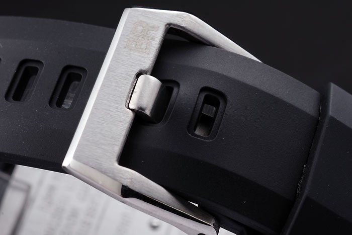 Armband: Schwarzes Kautschukband mit Wärme geprägtes Logo, Modellnummer und Produktcode und BR graviert gebürstetem Edelstahl Haken-Schließe