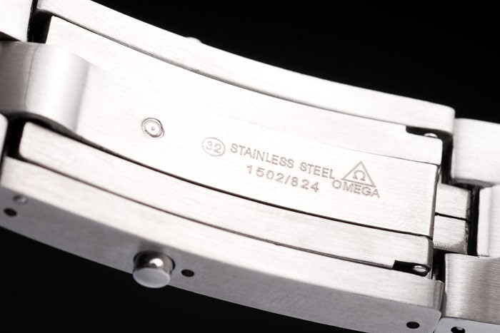 Armband: gebürstetes Edelstahl-Gliederarmband mit Omega bezeichnet Überfaltposition Push-Release clasp