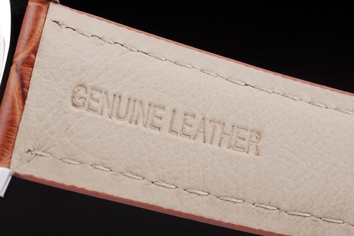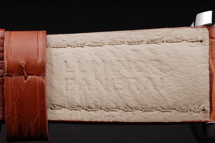 Armband: Braunes Lederarmband mit weißen Nähten und Wärme geprägt Luminor Panerai Stempel und poliertem Edelstahl Haken -Schnalle Spange mit Panerai engraving