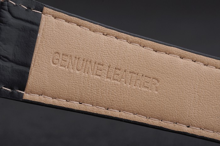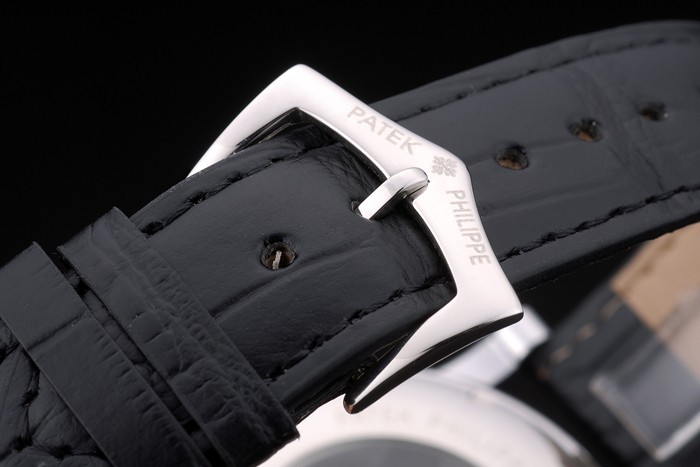 Armband: Schwarz Krokodillederband mit Wärme geprägt Patek Philippe Stempel und poliertem Edelstahl Haken- Schließe mit Patek Philippe engraving